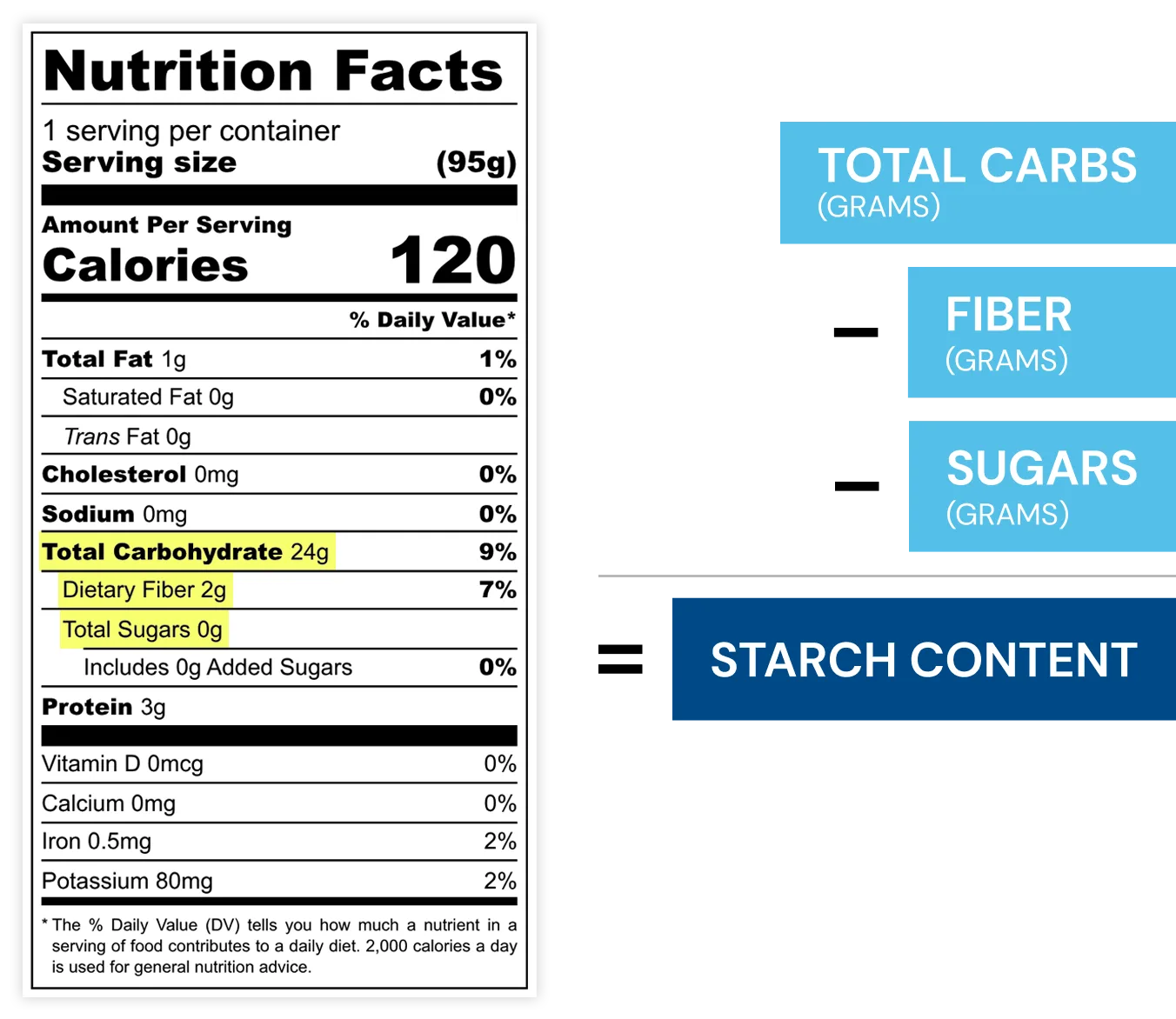 Food manufacturers usually are required to list the amount of total carbohydrates, sugars, and fiber in a food product, but not the starch content. Fortunately, you can easily calculate the starch content using simple subtraction.